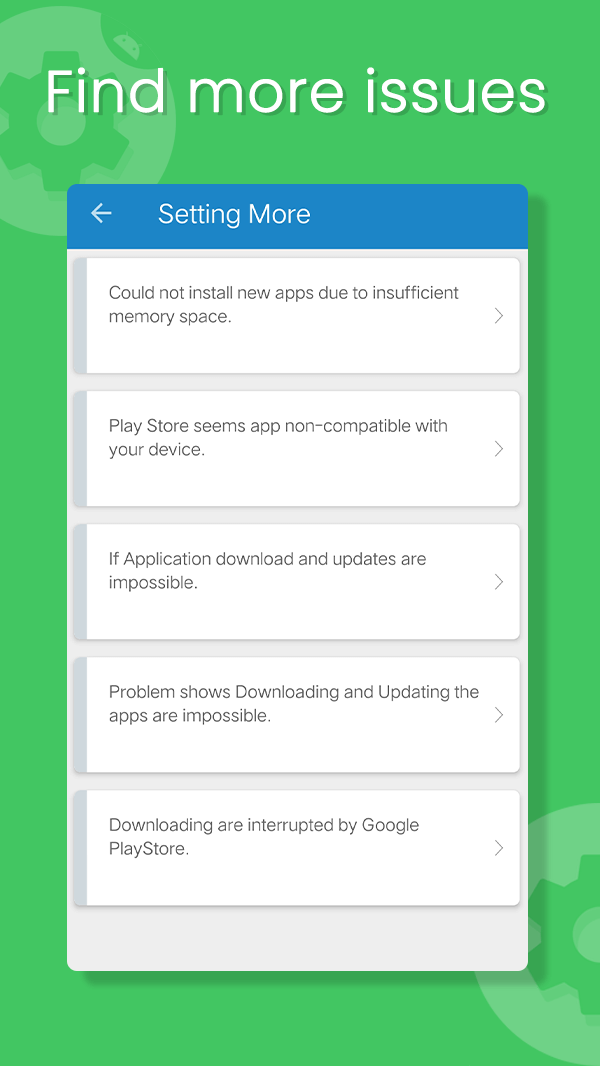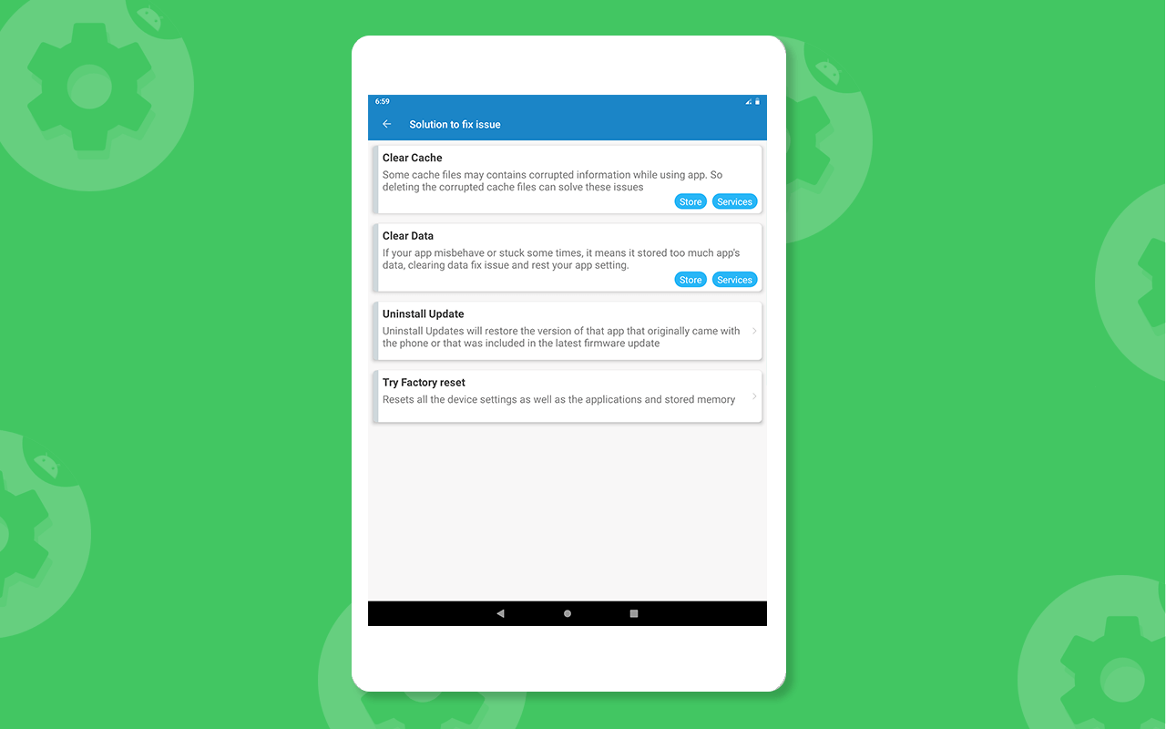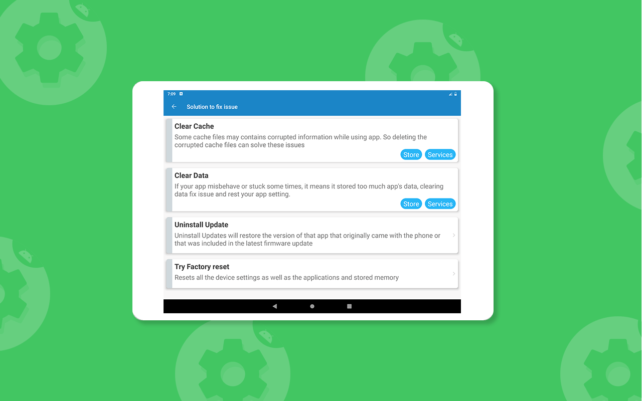 The application is providing you with the possible errors and the solutions to fix them easily such as update play services, clearing app and Google Services Framework cache etc.